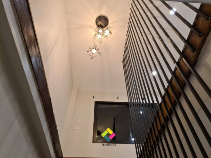 บริเวณนี้คือบันไดทางขึ้นชั้นสอง ซึ่งเป็นบันไดไม้แบบโปร่ง ช่วยให้พื้นที่ในห้องดูโปร่งโล่งยิ่งขึ้นไปอีก