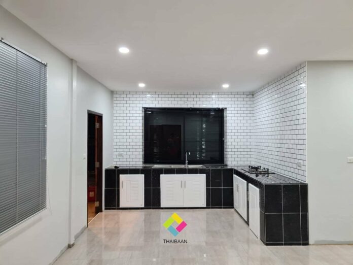 บริเวณนี้คือห้องครัวที่มีประตูเชื่อมต่อสู่ภายนอกโดยตรง ตกแต่งในโทนสีขาวดำ ติดตั้งเคาน์เตอร์ครัวทรงตัวแอล พร้อมด้วยผนังกันเปื้อนลายอิฐสีขาว สวยงาม โดดเด่น มีเอกลักษณ์