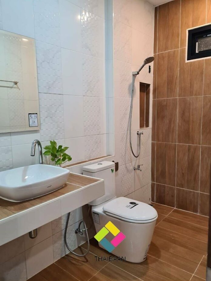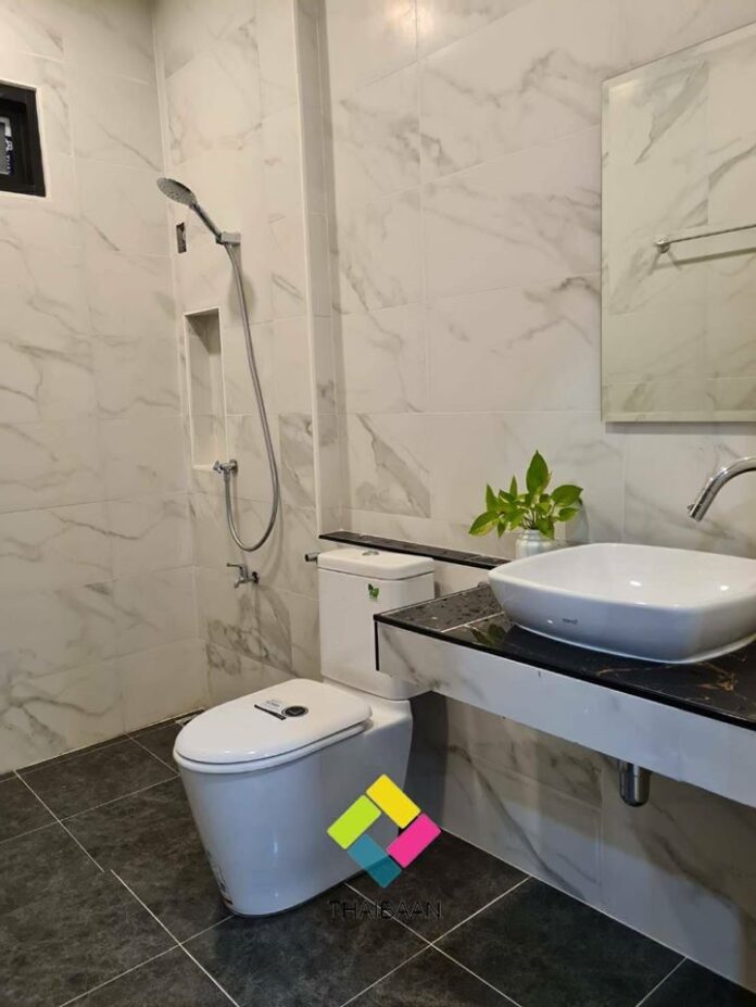 ในส่วนของห้องน้ำก็มีความสวยงามที่ดูลงตัวไม่น้อย ด้วยผนังลายหินอ่อนโทนสีขาวและผนังกระเบื้องลายไม้ที่ผสานกันได้อย่างน่ามอง พร้อมฟังก์ชันการใช้งานที่ครบครัน