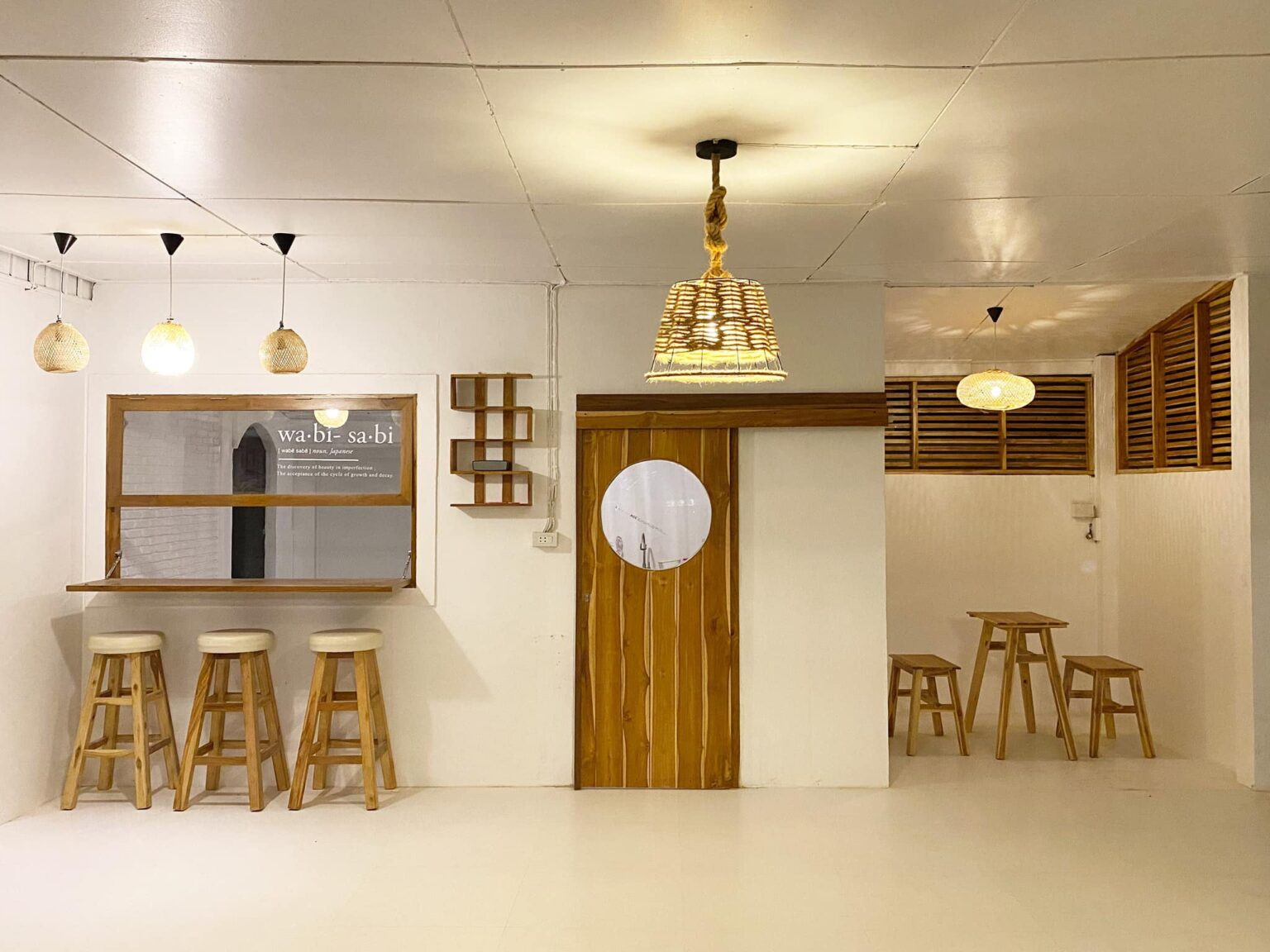 พื้นที่ส่วนครัว บาร์แบะมุมรับประทานอาหาร ยังคงคอนเซ็ปต์แบบมินิมอล โดยยังนำเอาแนวคิด “วาบิ ซาบิ” หรือความงามจากความไม่สมบูรณ์แบบมาใช้เป็นแนวคิดหลักในการตกแต่งอีกด้วย