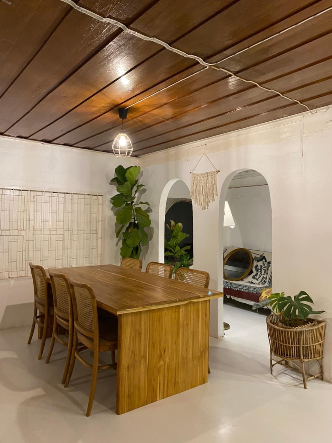 อีกมุมของพื้นที่รับประทานอาหาร โดยเป็นโต๊ะไม้ยาวพร้อมเก้าอี้ไม้หวาย เพิ่มความสดชื่นด้วยกระถางต้นไม้ที่วางอยู่รายล้อม