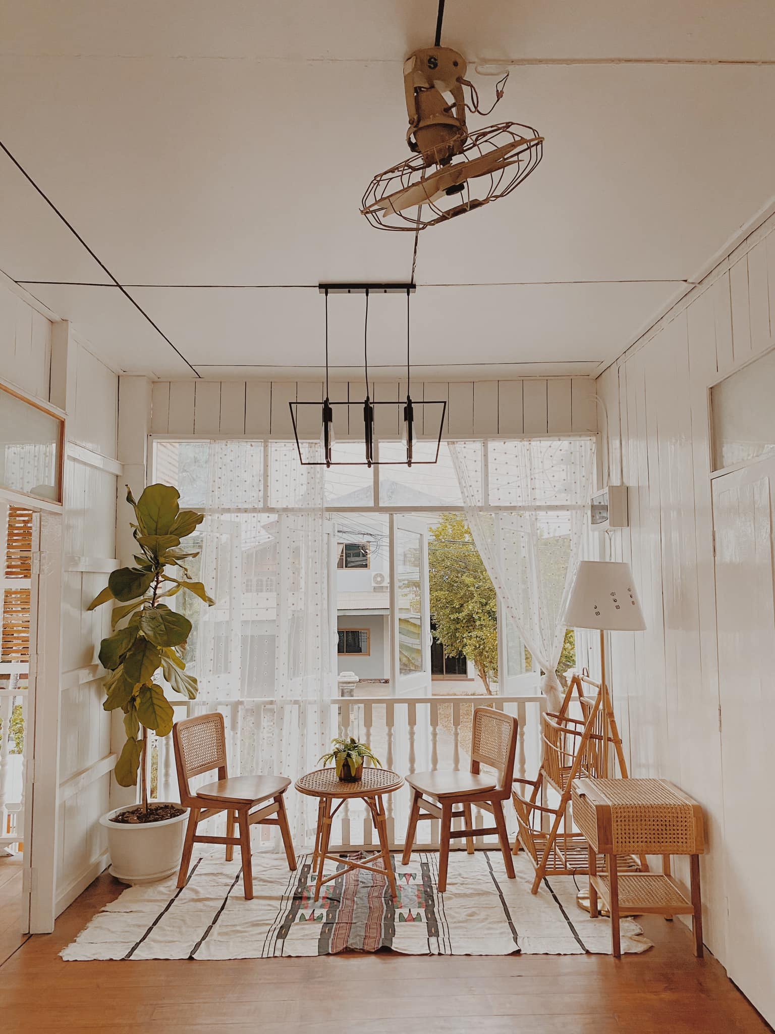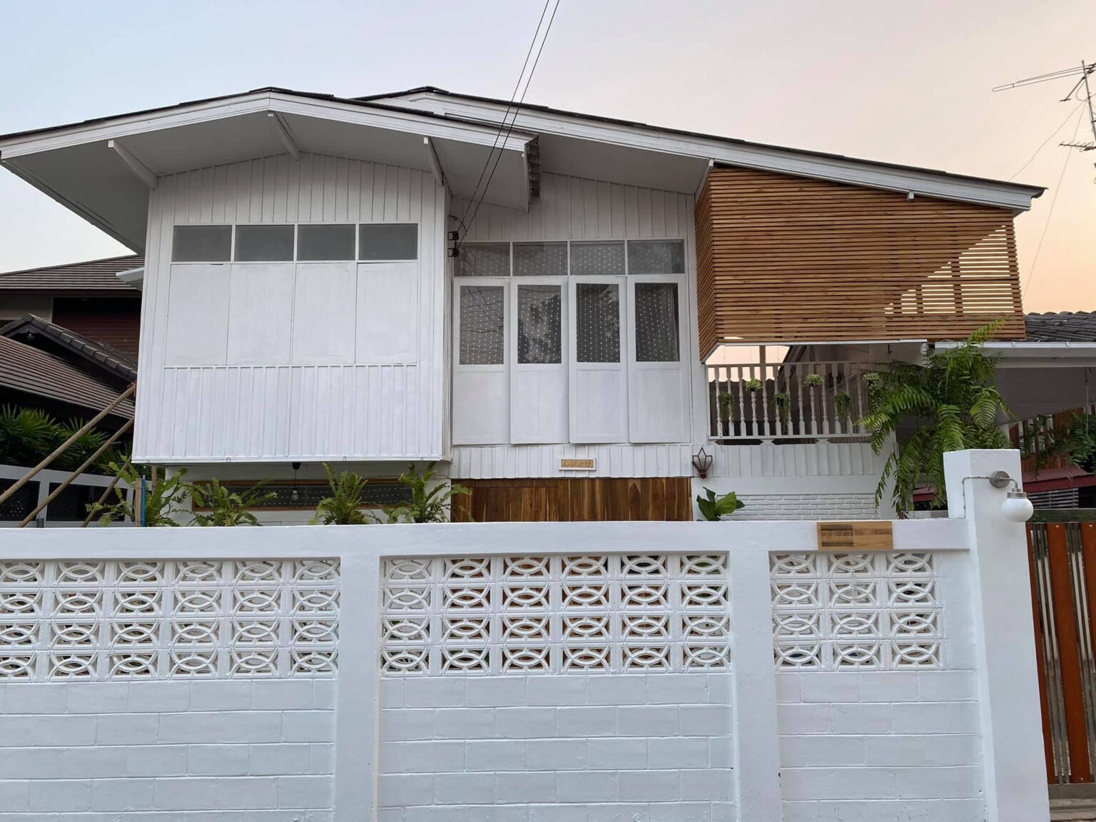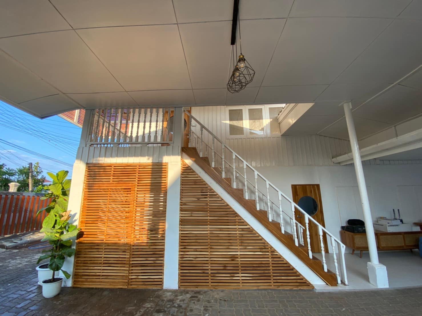 ระแนงไม้ตรงบันไดขึ้นบ้านบริเวณนี้เป็นระแนงไม้สักที่ให้โทนสีอบอุ่นไปกับสีขาวครีมจากส่วนอื่น ๆ ของตัวบ้าน เป็นอีกมุมที่น่าถ่ายรูปสุด ๆ