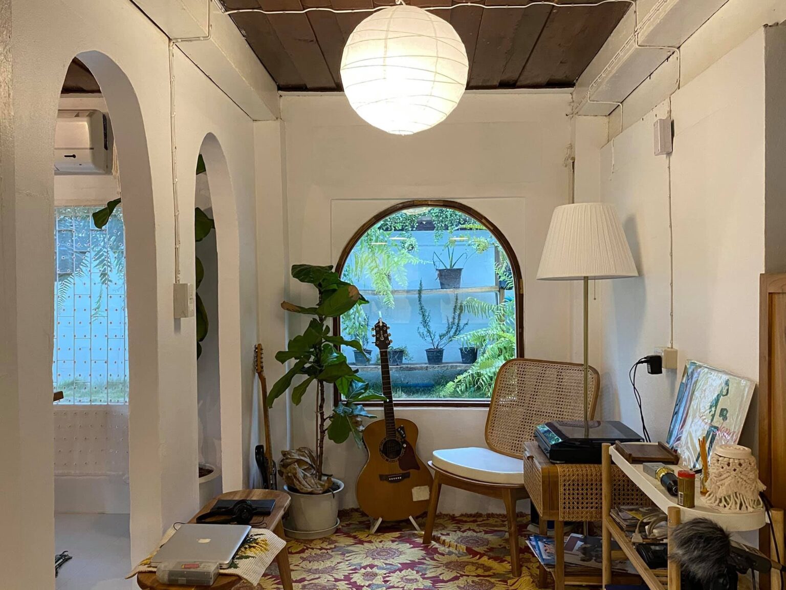 มุมนั่งเล่นมุมโปรดสำหรับเจ้าของบ้าน มีหน้าต่างทรงโค้งดูโดดเด่น ภายในตกแต่งด้วยเฟอร์นิเจอร์ไม้หวาย ทำให้สามารถนั่งทำงาน หรือเล่นดนตรีได้อย่างเพลิดเพลิน