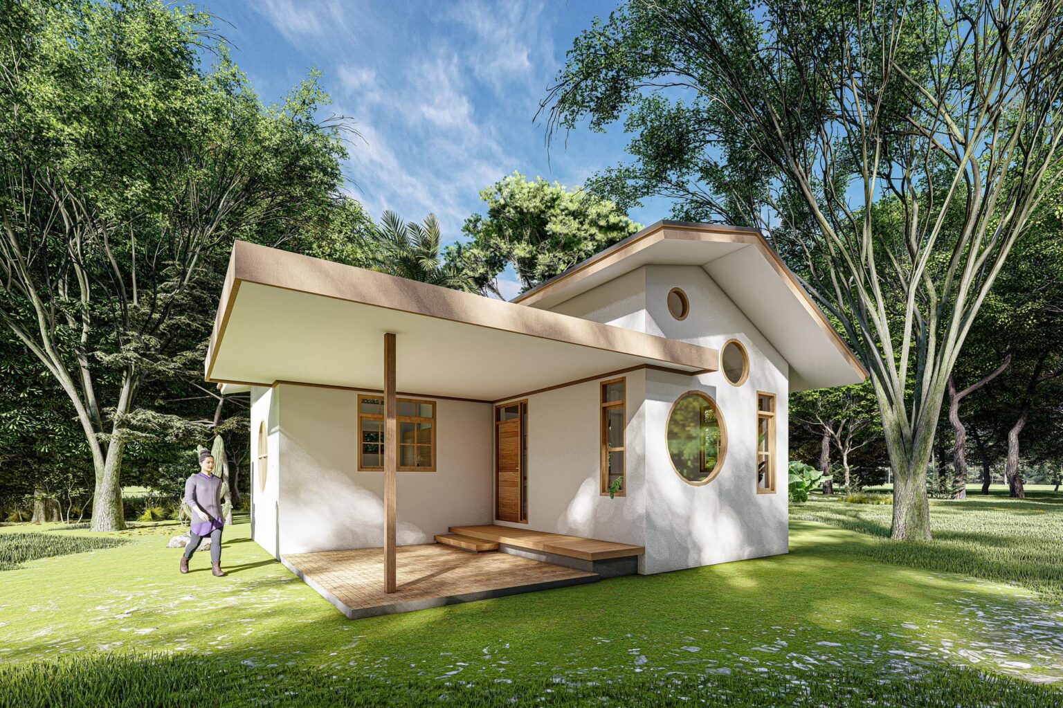 ในการเลือกใช้หน้าต่าง สถาปนิกได้ติดตั้งทั้งหน้าต่างทรงกลม รวมถึงหน้าต่างทรงสี่เหลี่ยมเอาไว้โดยรอบ นอกจากนี้ยังมีเฉลียงหน้าบ้านเอาไว้ใช้งานตามความต้องการอีกด้วย