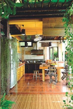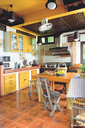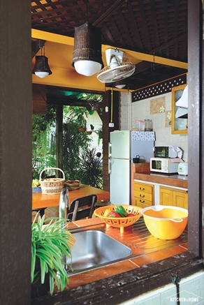 บรรยากาศครัวเปิดโล่ง ได้รับแสงสว่างจากภายนอกได้อย่างเต็มที่ ช่วยในเรื่องของอากาศถ่ายเทขณะทำอาหารได้ดี ส่วนโครงสร้างของเคาน์เตอร์ครัวเป็นคอนกรีต ท็อปเคาน์เตอร์ปูด้วยแผ่นกระเบื้อง ทำความสะอาดง่าย เหมาะกับการทำอาหารหนักๆ ได้เป็นอย่างดี