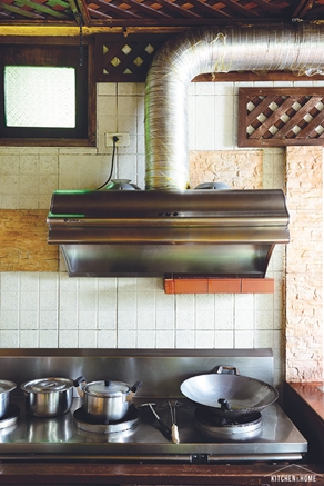 มุมทำอาหารเลือกใช้หัวเตาแบบฟู่ ไฟแรง และท็อปเตาสเตนเลสเหมาะกับครัวหนักแล้วยังรักษาและทำความสะอาดง่าย ส่วนเครื่องดูดควันเลือกกำลังวัตต์สูงๆ โชว์ให้เห็นงานระบบ เพราะตั้งใจให้ดีไซน์ครัวออกมาไม่เนี้ยบมาก