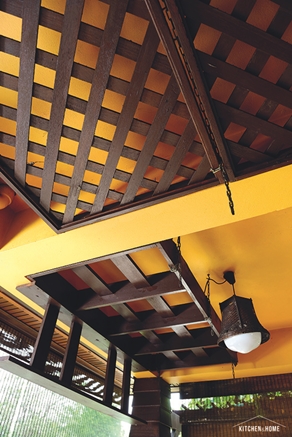 เพิ่มลูกเล่นตรงฝ้าเพดานด้วยระแนงไม้ ให้ล้อไปกับซุ้มระแนงด้านนอก