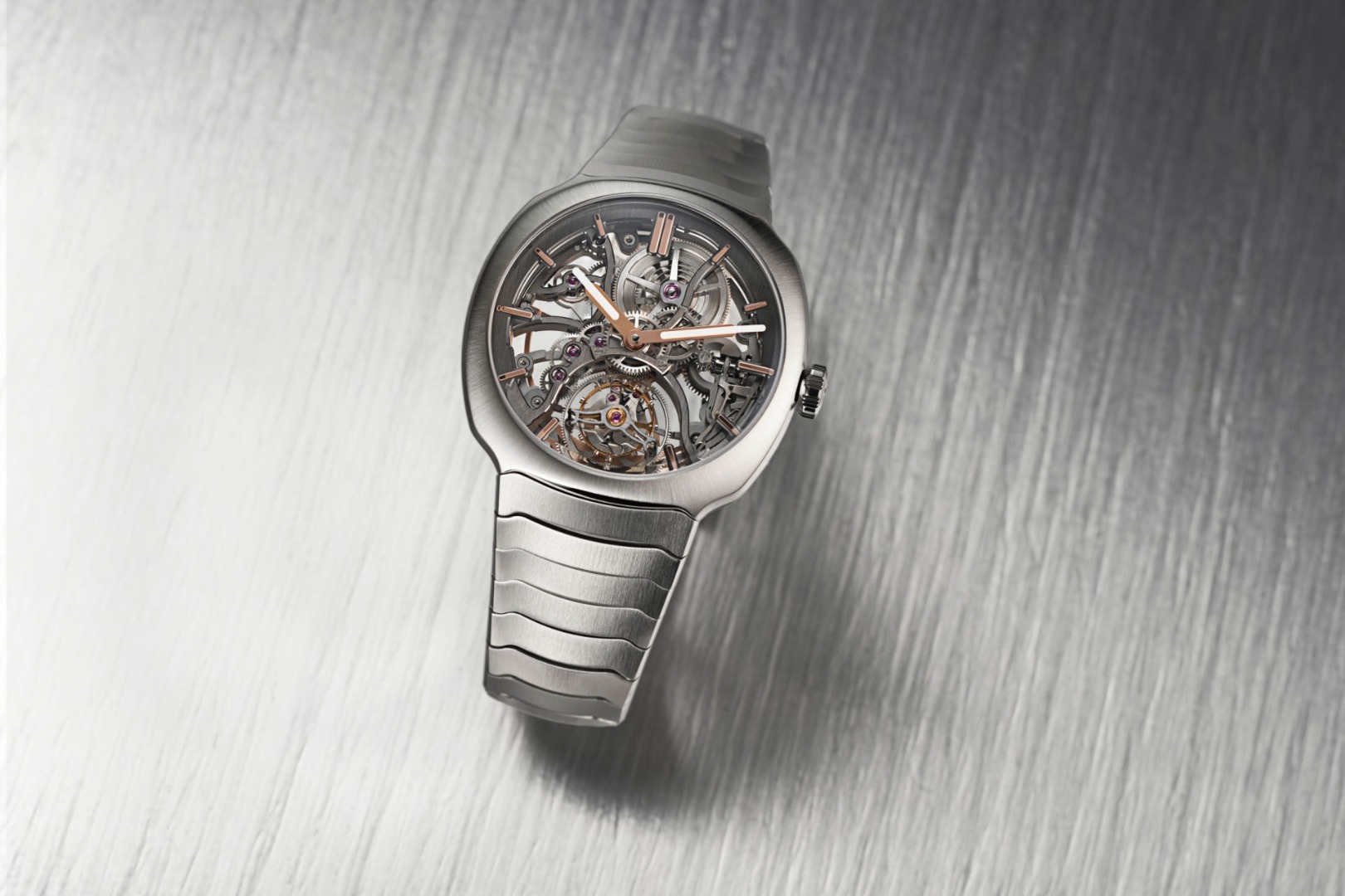 นาฬิกาเรือนนี้โดดเด่นด้วยดีไซน์โปร่งใส มองทะลุได้เกือบทั้งหมด ส่วนกลไกตูร์บิยงซึ่งมาพร้อมบาลานซ์สปริงคู่ ดูราวกับลอยอยู่ในอากาศ ผสานกับสายนาฬิกาที่ลื่นไหลเป็นเนื้อเดียวกับตัวเรือนได้อย่างลงตัว ราวกับออกแบบมาเพื่อการเคลื่อนไหวที่รวดเร็วโดยเฉพาะ