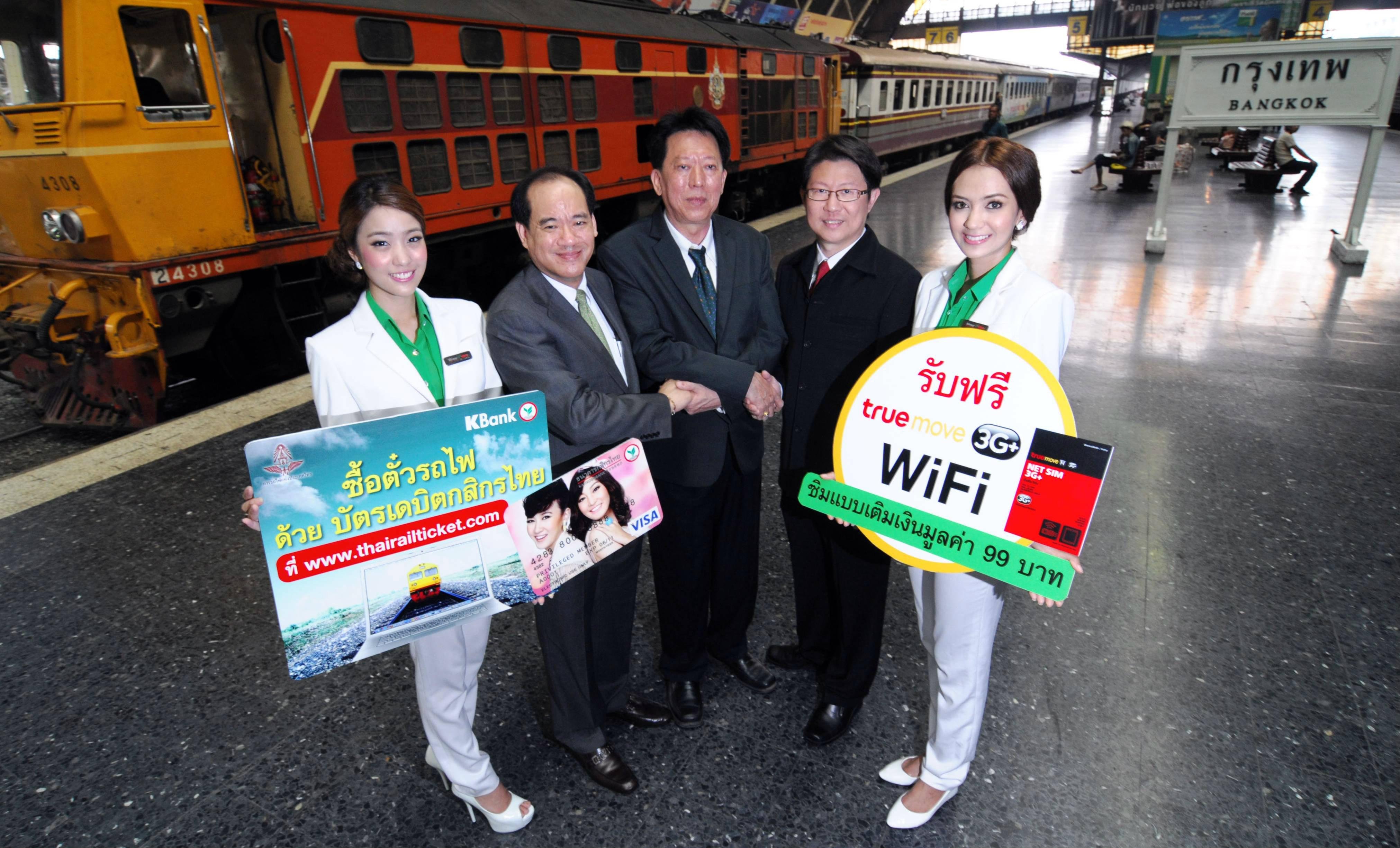 นายปกรณ์ พรรธนะแพทย์ รองกรรมการผู้จัดการ ธนาคารกสิกรไทย นายภากรณ์ ตั้งเจตสกาว รองผู้ว่าการรถไฟแห่งประเทศไทย และนายวิฑูรย์ เจียมศิริกาญจน์ รองผู้อำนวยการ ธุรกิจพรีเพด ทรูมูฟ เอช บริษัท เรียล มูฟ จำกัด ร่วมเปิดบริการ "ซื้อตั๋วรถไฟผ่านเว็บไซต์ด้วยบัตรเดบิตกสิกรไทย" มอบสิทธิพิเศษสำหรับผู้ซื้อบัตรโดยสารรถไฟผ่านเว็บไซต์ www.thairailticket.com แล้วชำระค่าโดยสารด้วยบัตรเดบิตกสิกรไทย ตั้งแต่ 500 บาทขึ้นไป รับซิมการ์ดเน็ตซิม 3G+ จากทรูมูฟ เอช ฟรี เริ่มตั้งแต่วันนี้ถึง 15 มิถุนายน 2555 สอบถามรายละเอียดเพิ่มเติมได้ที่ K-Contact Center 0 2888 8888