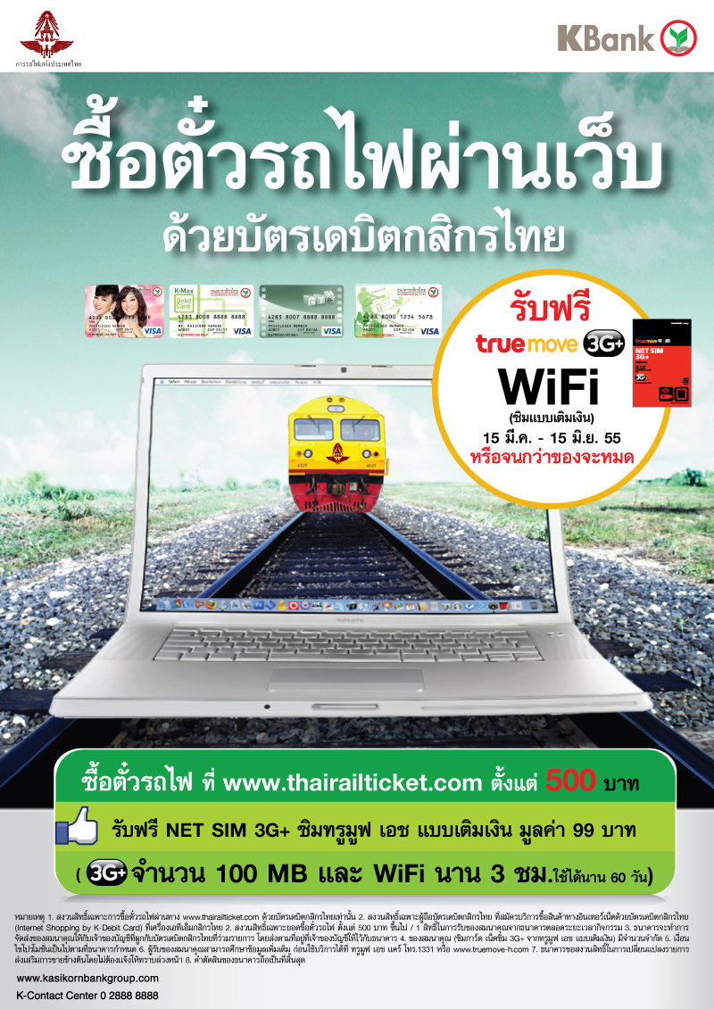 กสิกรไทย ซื้อตั๋วรถไฟผ่านบัตรเดบิตกสิกรไทย รับเน็ตซิม 3G+ ฟรี