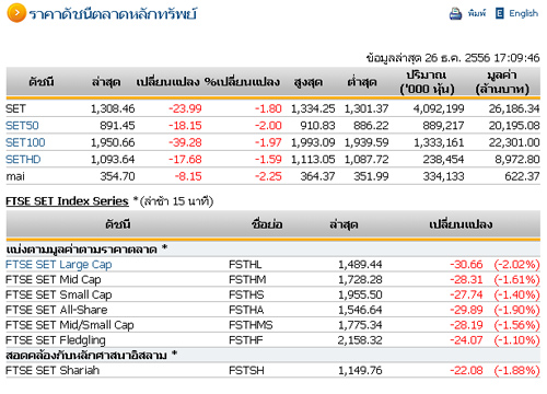 สำหรับการซื้อขายในตลาดหลักทรัพย์ ตลอดทั้งวันที่ผ่านมา ปิดตลาดดัชนี ปรับตัวลดลง 23.99 จุด มาปิดที่ 1,308.46 จุด ด้วยมูลค่าการซื้อขาย 26,186.34 ล้านบาท
