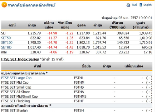 บรรยากาศการลงทุนในตลาดหุ้นไทยเช้าวันนี้ (3 ม.ค.) เปิดทำการเมื่อเวลา 10.00 น. ดัชนีปรับตัวลดลง 14.98 จุด แตะที่ระดับ 1,215.79 จุด ด้วยมูลค่าการซื้อขาย 1,939.45 ล้านบาท