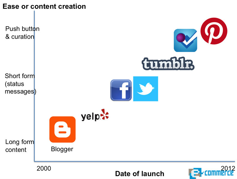Elad Gil นักลงทุนจาก Silicon Valley และเจ้าของ Mixer Labs บริษัทที่ถูก Twitter ซื้อไปเมื่อไม่นานมานี้ ได้แสดงความเห็นว่า เครือข่ายสังคมออนไลน์ก่อนหน้า Pinterest สามารถแบ่งได้เป็น 3 ยุคหลักด้วยกัน โดยแบ่งตามความยาวของคอนเทนต์ที่ผู้ใช้สร้างขึ้นซึ่งน้อยลงเรื่อยๆ ไล่ไปตั้งแต่