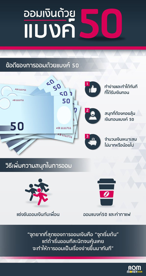 หลายคนที่เคยท้อใจกับการออมเงินแล้วคิดว่าตนเองไม่สามารถออมเงินได้ เราอยากจะให้เริ่มต้นออมด้วย แบงก์ 50 นะจ๊ะ เก็บไปเรื่อยๆแบบไม่ต้องคิดอะไรมาก เมื่อครบ 1 ปี ค่อยเปิดออกมานับแล้วไปฝากธนาคาร หรือไปลงทุนอื่นๆต่อไป เราอาจจะเพิ่มความสนุกในการออมเงินให้มากขึ้น โดยการแข่งขันกันออมเงิน กับคนในครอบครัวหรือชวนเพื่อนร่วมงานออมเงินก็ได้ จะได้รู้สึกมีแรงกระตุ้นอยากออมเงินมากขึ้น