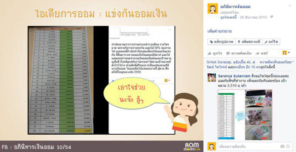 แฟนเพจท่านนี้ตั้งแก๊งออมเงินกับเพื่อนที่ทำงาน 3 คนมาตั้งแต่กลางปี 58 ซึ่งแต่ละคนจะประมาณการไว้ว่าปีนี้จะออมเงินได้เท่าไหร่ ทำเป็นตารางใน Excel ออกมา ถ้าใครทำได้ต่ำกว่าเป้าที่ตัวเองตั้งไว้แสดงว่าแพ้และต้องเลี้ยงข้าว แต่สุดท้ายก็ไม่มีใครยอมใคร