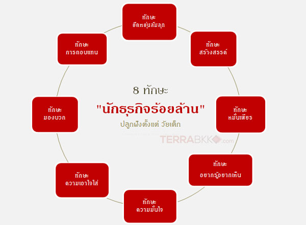 TerraBKK ขอเสนอ 8 ทักษะ ปลูกฝังการเป็น “ นักธุรกิจร้อยล้าน ” ตั้งแต่วัยเด็ก พร้อมเติบโตกลายเป็นผู้ใหญ่ที่มีความคิดอ่าน มีทัศนคติที่ดี เป็นผู้ประกอบการที่ยิ่งใหญ่และประสบความสำเร็จ รายละเอียดดังนี้