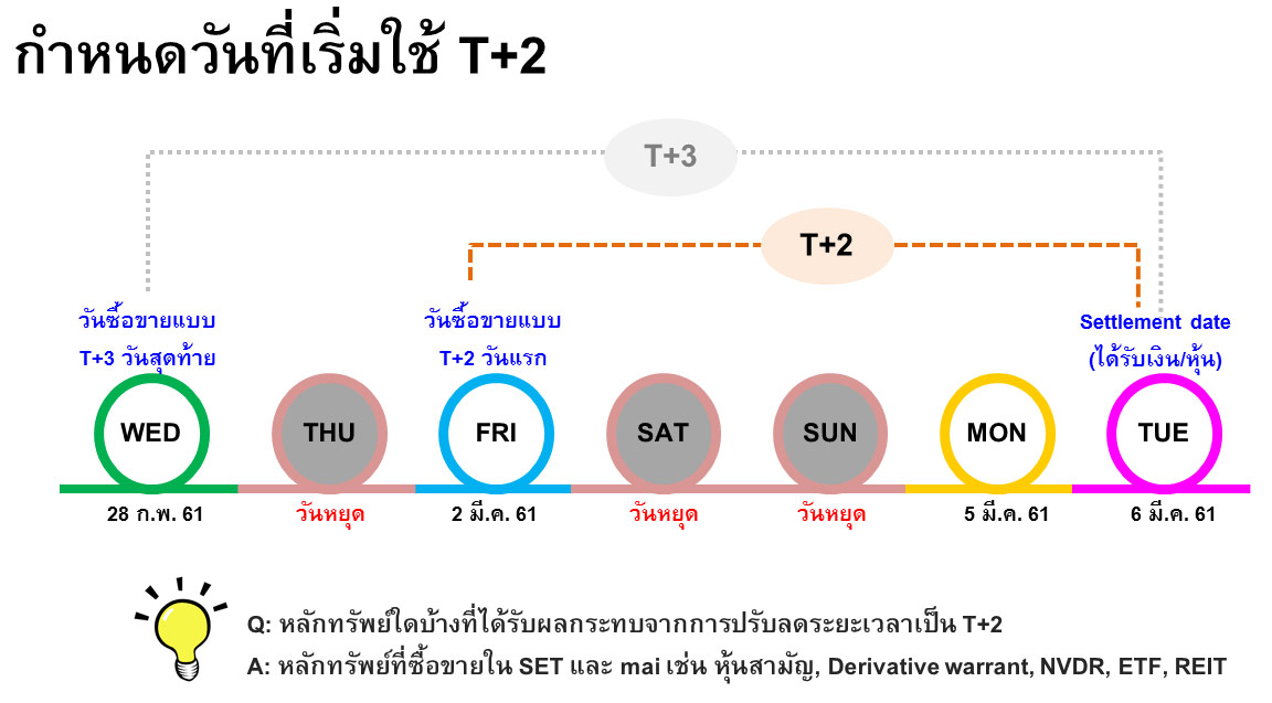 ตลาดหลักทรัพย์ฯ และภาคตลาดทุน เตรียมความพร้อมในการลดระยะเวลาการชำระราคาและส่งมอบหลักทรัพย์เป็น T+2 โดยจะเริ่มใช้วันนี้เป็นวันแรก (2 มี.ค. 2561) ซึ่ง T+2 จะช่วยลดความเสี่ยงด้านการส่งมอบหลักทรัพย์ของอุตสาหกรรม พร้อมทั้งลดต้นทุน และเป็นแนวทางเดียวกับตลาดหลักทรัพย์ชั้นนำในต่างประเทศ