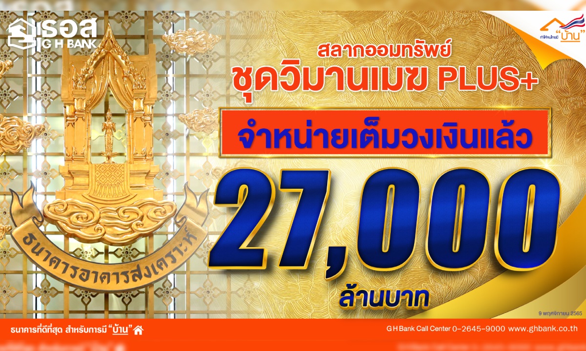 ธนาคารอาคารสงเคราะห์ (ธอส.) แจ้งให้ทราบว่า สลากออมทรัพย์ ธอส. ชุด“วิมานเมฆ Plus” หน่วยละ 1 ล้านบาท ของ ธอส. ที่เปิดจำหน่ายตั้งแต่วันที่ 1 ตุลาคม 2565 ที่ผ่านมา ล่าสุดปรากฏว่า มีลูกค้าประชาชนให้ความสนใจซื้อสลากฯ เป็นจำนวนมาก ส่งผลให้ ณ วันที่ 8 พฤศจิกายน 2565 สามารถจำหน่ายได้เต็มกรอบวงเงิน 27,000 ล้านบาทแล้ว ธนาคารขอขอบคุณลูกค้าประชาชนทุกท่านที่ให้ความสนใจซื้อสลากออมทรัพย์ดังกล่าว ซึ่งถือเป็น สลากพรีเมี่ยมที่ธนาคารเปิดจำหน่ายในราคาหน่วยละ 1 ล้านบาท จำนวน 27,000 หน่วย (แบ่งเป็น 3 หมวด ๆ ละ 9,000 หน่วย) กรอบวงเงินรวม 27,000 ล้านบาท อายุสลาก 2 ปี เมื่อฝากครบกำหนดรับผลตอบแทนหน้าสลากสูงถึง 1.45% ต่อปี โดยเมื่อฝากครบกำหนดจะได้รับเงินต้นพร้อมดอกเบี้ยรวมหน่วยละ 1,029,000 บาท พร้อมกันนี้ยังมีสิทธิ์ลุ้นรางวัลทุกวันที่ 16 ของเดือน รวม 24 งวด โดยรางวัลที่ 1 มูลค่าสูงถึง 3 ล้านบาท สอบถามรายละเอียดเพิ่มเติมได้ที่ ธอส.ทุกสาขาทั่วประเทศ G H Bank Call Center โทร 0-2645-9000 หรือ Facebook Fanpage ธนาคารอาคารสงเคราะห์ และติดตามข่าวสารของธนาคารได้ที่ Mobile Application : GHB ALL , Mobile Application : GHB ALL GEN และ www.ghbank.co.th