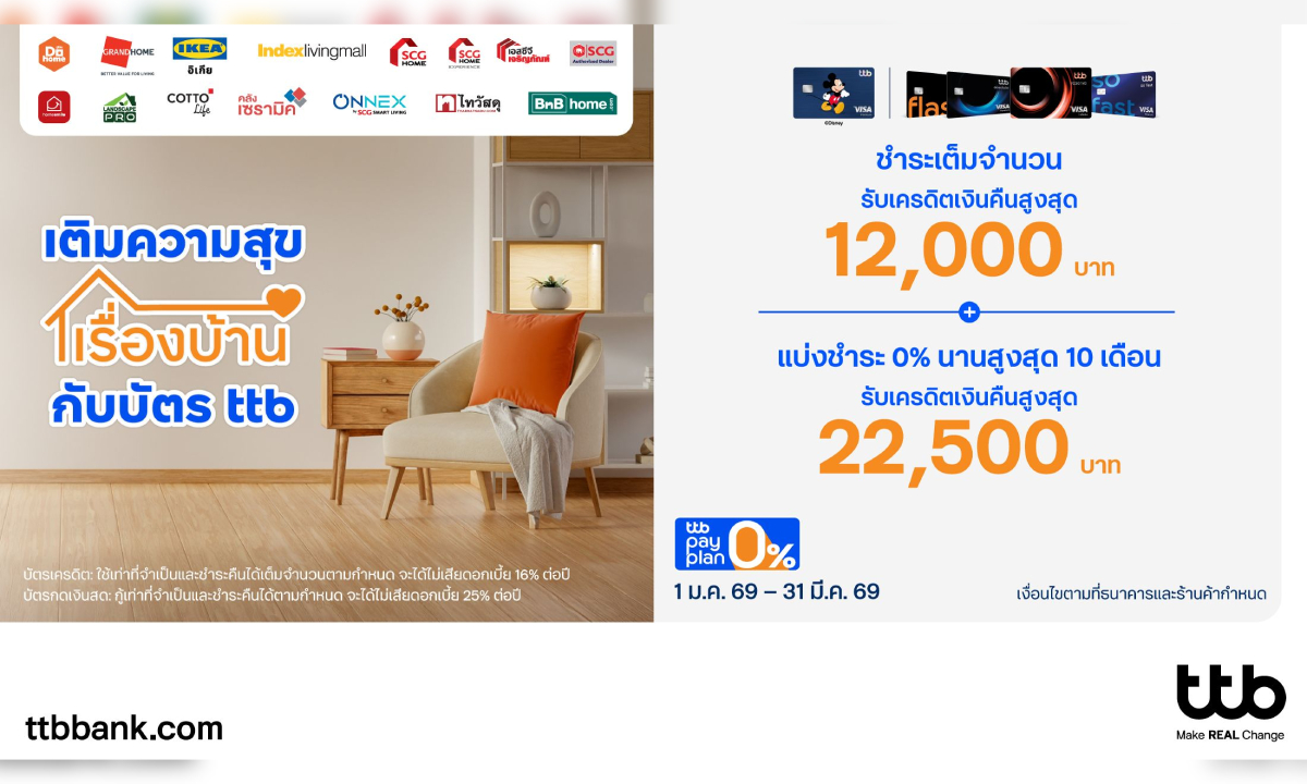 ทีทีบี มอบความคุ้มค่าให้กับคนรักบ้าน ชวนสมาชิกบัตรเครดิต และบัตรกดเงินสด ttb ช้อปสุดคุ้มสินค้าเกี่ยวกับบ้านตั้งแต่ต้นปี ไม่ว่าจะเป็นเฟอร์นิเจอร์ ของตกแต่ง หรือวัสดุก่อสร้าง จากร้านค้าพันธมิตรชั้นนำ ได้แก่ Do Home, GRANDHOME, IKEA (เฉพาะ IKEA Thailand และเป็นสกุลเงินบาทเท่านั้น), Index Living Mall, SCG (เฉพาะที่ SCG HOME Experience, เอสซีจี เจริญภัณฑ์, ร้านค้าที่มีสัญลักษณ์ SCG Authorized Dealer เฉพาะร้านที่ร่วมรายการ, Cotto Life และคลังเซรามิคที่ร่วมรายการ, ช่องทางออนไลน์ของ SCG Home Experience และ SCG Living and Housing Solution (HomeSmile), Landscape PRO, ONNEX by SCG SMART LIVING, www.scghome.com, www.cottolife.com), ไทวัสดุ และ BnB Home โดยลูกค้าสมาชิกบัตรเครดิต และบัตรกดเงินสด ttb ที่มียอดชำระตั้งแต่วันที่ 1 มกราคม 2569 – 31 มีนาคม 2569 จะได้รับสิทธิพิเศษ ดังนี้