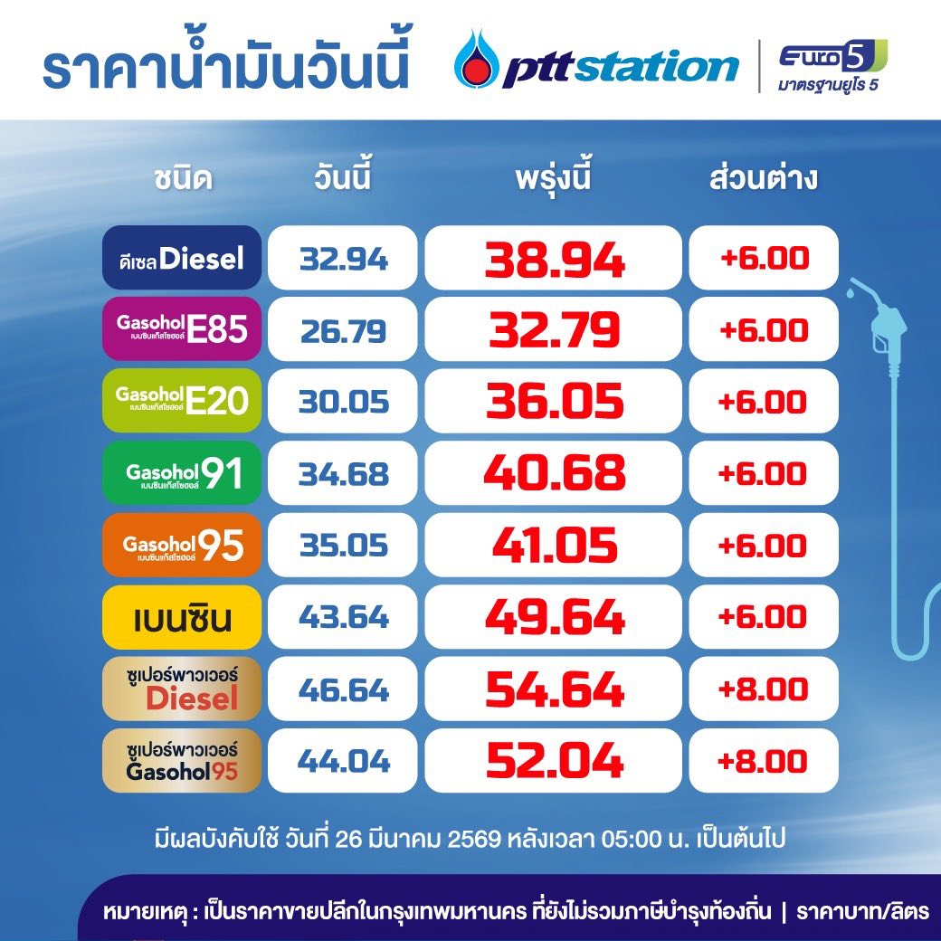 ราคาน้ำมันปรับขึ้นแรง 6 บาท/ลิตร มีผล 26 มี.ค. 2569 เนื่องจากราคาน้ำมันโลกพุ่งจากความตึงเครียดในตะวันออกกลาง ทำให้ต้นทุนสูงขึ้นอย่างมาก ขณะเดียวกันกองทุนน้ำมันเชื้อเพลิงต้องแบกรับภาระชดเชยวันละหลายพันล้านบาทจนสภาพคล่องตึงตัว จึงจำเป็นต้องลดการอุดหนุน และยังต้องปรับราคาให้ใกล้เคียงประเทศเพื่อนบ้านเพื่อป้องกันการลักลอบและเก็งกำไร ส่งผลให้ต้องขึ้นราคาน้ำมันครั้งใหญ่ในครั้งนี้