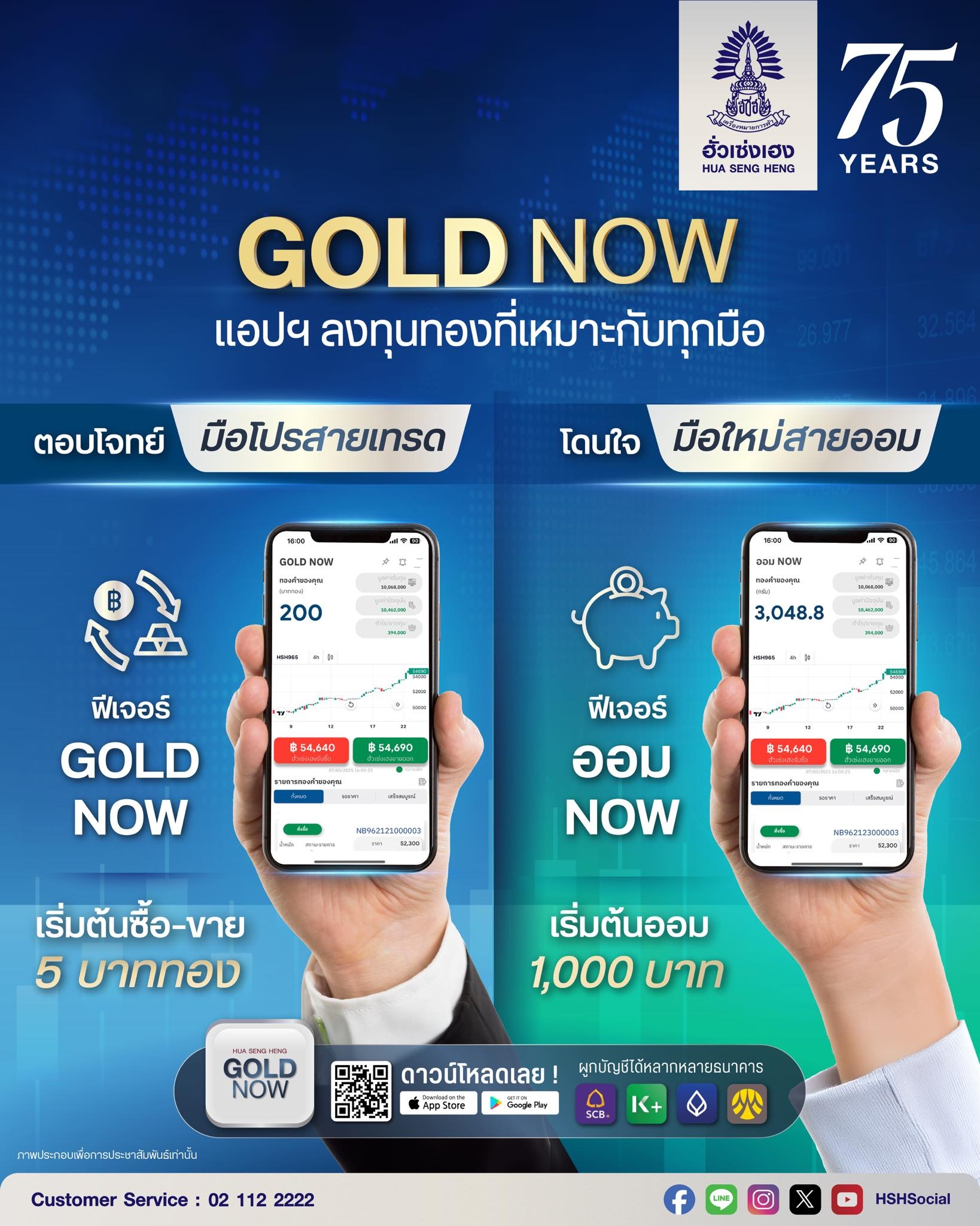 - GOLD NOW โดย ฮั่วเซ่งเฮง: แอปยอดฮิตจากร้านทองระดับตำนาน มีฟีเจอร์ "ออม NOW" ที่ปรับลดขั้นต่ำลงมาเพื่อให้เข้าถึงง่ายขึ้น (ปัจจุบันเริ่มต้นประมาณ 1,000 บาท) จุดแข็งคือความน่าเชื่อถือสูงและมีสาขาให้เลือกรับทองจริงได้สะดวกหลายแห่งในกรุงเทพฯ