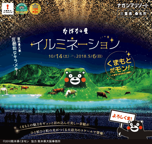 สำหรับงานประดับไฟ Nabana no Sato ในครั้งนี้พิเศษสุดๆ ไปเลย เพราะได้จับเอาคาแรคเตอร์หมีสีดำสุดกวนอย่าง คุมะมง (Kumamon) มาสคอตประจำจังหวัดคุมาโมโตะ มาเป็นตัวหลักของงานครั้งนี้ในธีม Kumamoto damon! ใครเป็นแฟนคลับคุมะมงรีบจองไป ทัวร์ญี่ปุ่น ด่วนๆ เพราะงานประดับไฟธีมคุมะมงแบบนี้ไม่ได้หากันง่ายๆ นะ