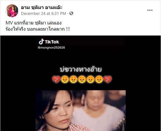 โดย อาม ชุติมา ได้ย้อนนำคลิปเอ็มวี "บ่ขวางทางอ้าย" มาโพสต์ลงในแฟนเพจ อาม ชุติมา อามแอ๊ะ พร้อมแคปชั่นว่า "MV แรกที่อาม ชุติมา เล่นเองร้องไห้จริง บอกเลยมาไกลมาก" จนมีแฟนๆ จำนวนมากมากดแสดงความรู้สึก