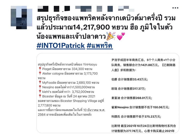 แพทริค INTO1 มาแรง! หลังเดบิวต์ครึ่งปีแต่ทำยอดขายธุรกิจมูลค่าทะลุ 71 ล้านบาท