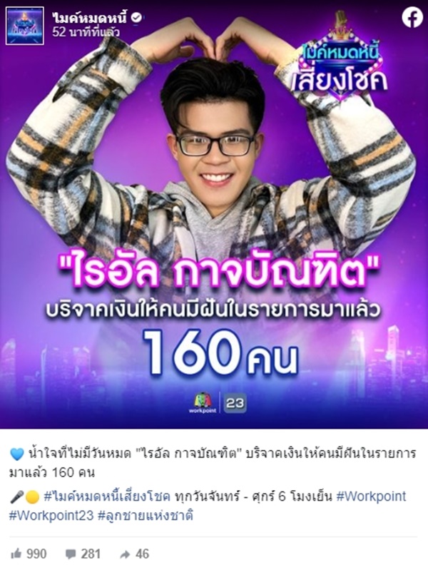 และล่าสุดในวันที่ 7 มิถุนายน ทางรายการได้เผยข้อมูลและภาพอีกว่า "น้ำใจที่ไม่มีวันหมด "ไรอัล กาจบัณฑิต" บริจาคเงินให้คนมีฝันในรายการ มาแล้ว 160 คน" ซึ่งโพสต์ดังกล่าวและ 3 โพสต์ก่อนหน้าได้รับความสนใจอย่างมากจากแฟนๆ