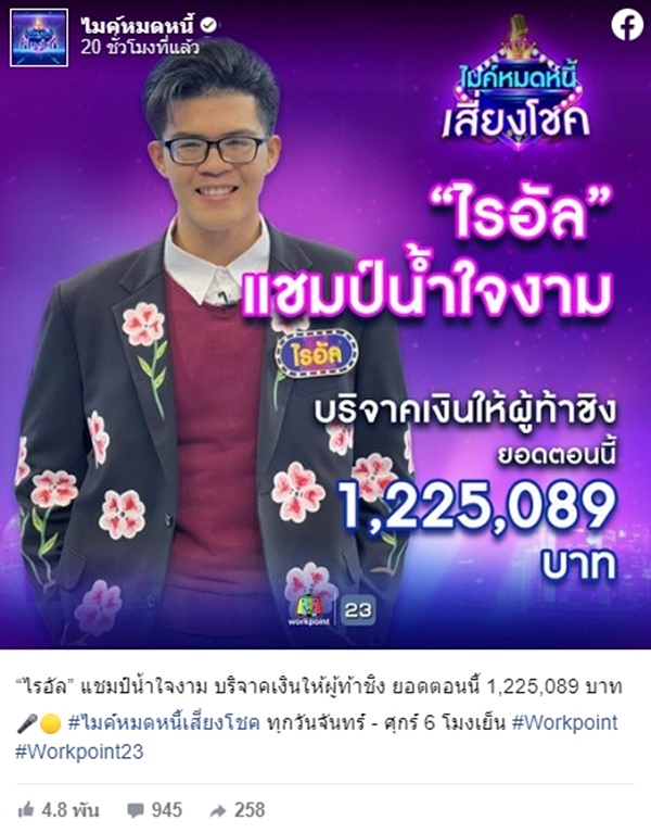 ที่ผ่านมา ไรอัล-กาจบัณฑิต จำปาศิลป์ ผู้เข้าแข่งขันรายการ ไมค์หมดหนี้ เสี่ยงโชค ที่ปัจจุบันคว้าแชมป์รายการ 182 สมัย ได้กลายเป็นที่พูดถึง หลังประสบความสำเร็จในรายการ จนกวาดเงินรางวัลจำนวนมาก โดยล่าสุดทางรายการได้เปิดเผยข้อมูลน่าสนใจ เรื่องการรับเงินรางวัลของไรอัล