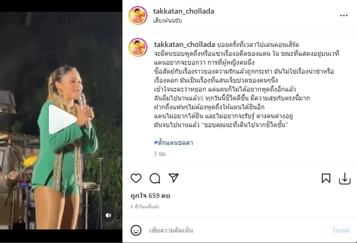 โดยตั๊กแตนได้อัดคลิปพูดความในใจถึงอดีต พร้อมแคปชั่นว่า "บ่อยครั้งที่เวลาไปเล่นคอนเสิร์ต จะมีคนชอบพูดถึงหรือแซวเรื่องอดีตของแตน ใน ขณะที่แสดงอยู่บนเวที แตนอยากจะบอกว่า การที่ผู้หญิงคนนึง ซื่อสัตย์กับเรื่องราวของความรักแล้วถูกกระทำ มันไม่ใช่เรื่องน่าขำหรือเรื่องตลก มันเป็นเรื่องที่แสนเจ็บปวดของคนๆนึง เข้าใจนะคะว่าหยอก แต่แตนก็ไม่ได้อยากพูดถึงอีกแล้ว ฉันลืมไปนานแล้ว!! ทุกวันนี้ชีวิตดีขึ้น มีความสุขกับตรงนี้มาก ฝากถึงแฟนๆ ไม่ต้องพูดถึงให้แตนได้ยินอีก แตนไม่อยากได้ยิน และไม่อยากจะรับรู้ ต่างคนต่างอยู่ มันจบไปนานแล้ว "ขอบคุณนะที่เดินไปจากชีวิตชั้น"