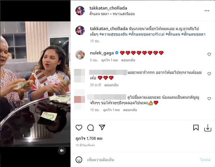 ซึ่งหลังจากโพสต์ไปปุ๊บ ก็มีแฟนๆ จำนวนมากเข้ามาคอมเมนต์ใต้โพสต์ชมความน่ารักของตั๊กแตนและคุณแม่พร้อมทั้งอวยพรให้ท่านมีสุขภาพแข็งแรง รวมถึง หนูเล็ก-ภัทราวดี ปิ่นทอง ที่เข้ามาแสดงความเห็นด้วยอิโมจิหัวใจสีแดง