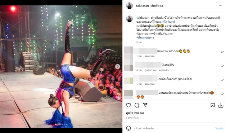 โดยตั๊กแตนได้โพสต์ข้อความและภาพของแดนเซอร์และข้อความว่า "นี่ไม่ใช่การโชว์กายกรรม แต่คือการเต้นแบบปกติ ของแดนเซอร์ตั๊กแตน #Tanband เบาได้เบาลู๊กเอ้ย อย่าว่าแต่แฟนๆหน้าเวทีตกใจเลย อิแม่ก็ตกใจ ไม่เคยชินกับการจัดหนักจัดเต็มของทีมแดนเซอร์สักที อยากเห็นของจริงต้องตามมาดูหน้าเวทีแล้วแหละ"