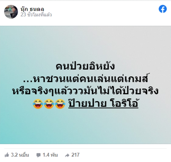 โดยนุ๊ก ธนดล ได้โพสต์แซวปายว่า "คนป่วยอิหยัง …หาชวนแต่คนเล่นแต่เกมส์ หรือจริงๆ แล้วววมันไม่ได้ป่วยจริง ป๊ายปาย โอริโอ้" ซึ่งโพสต์ดังกล่าว มีแฟนๆ เข้ามาแสดงความเห็นมากกว่าพันข้อความไปแล้ว