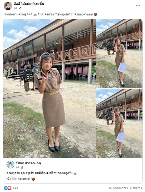 โดยลิลลี่ได้โพสต์ว่า "คุณครูครับ คุณครูครับ ผมมีเรื่องจะปรึกษาคุณครูครับ" และแชร์โพสต์ดังกล่าวอีกครั้งกับแคปชั่น "ฝากติดตามคุณครูลิลลี่ ในละครเรื่อง “ไอ้หนุ่มรถไถ” ด้วยนะค้าบบบ" ซึ่งแฟนๆ เข้ามาคอมเมนต์