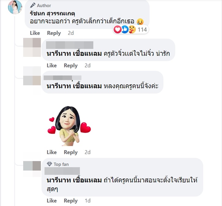 และในคอมเมนต์ของโพสต์ ลิลลี่ก็เขียนต่ออีกว่า "อยากจะบอกว่า ครูตัวเล็กกว่าเด็กอีกเธอ" ที่ทำให้หลายคนเข้ามาคอมเมนต์เรื่องความน่ารักกันอย่างล้นหลาม