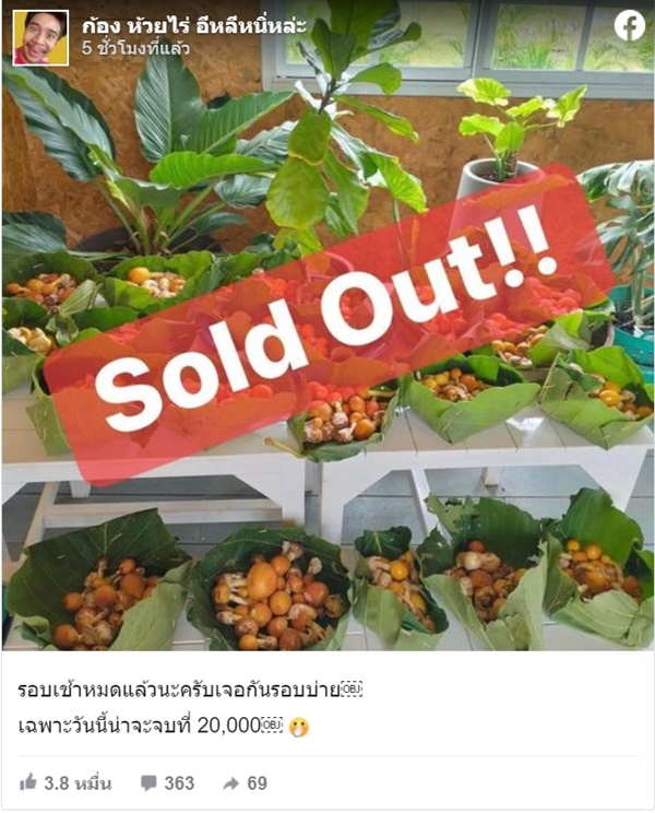 และล่าสุด ก้อง ห้วยไร่ ได้อัปเดตเกี่ยวกับการขายเห็ด "รอบเช้าหมดแล้วนะครับเจอกันรอบบ่าย เฉพาะวันนี้น่าจะจบที่ 20,000 บาท" จนมีหลายๆ คนเข้ามาคอมเมนต์ใต้โพสต์ดังกล่าว