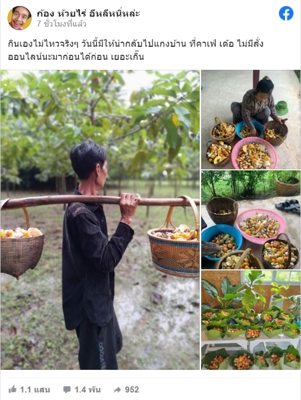 โดยก้อง ได้พิมพ์ข้อความและภาพการเก็บเห็ดว่า "เห็นละโงก จะออกทุกครั้งหลังจากมีฝนตก ช่วงนี้ฝนตกบ่อยเลยออกแทบทุกวัน ใครที่กำลังจะปลูกป่าหรือใครมีป่าอยู่แล้ว ดูแลอนุรักษ์มันไว้นะครับ ป่าให้ได้มากกว่าที่เราคิดจริงๆ ความสุขของพ่อแม่ผมยามแก่เฒ่าได้อยู่กับธรรมชาติ อันบริสุทธิ์ ไร้สารเคมีไร้ยาฆ่าแมลง เราให้เกียรติดินดินให้เกียรติเรา อีหลีน่า ดินแดนแห่งความสุข" ก่อนตามด้วยข้อความว่า "กินเองไม่ไหวจริงๆ วันนี้มีให้นำกลับไปแกงบ้าน ที่คาเฟ่ เด้อ ไม่มีสั่งออนไลน์นะมาก่อนได้ก่อน เยอะเกิ๊น"