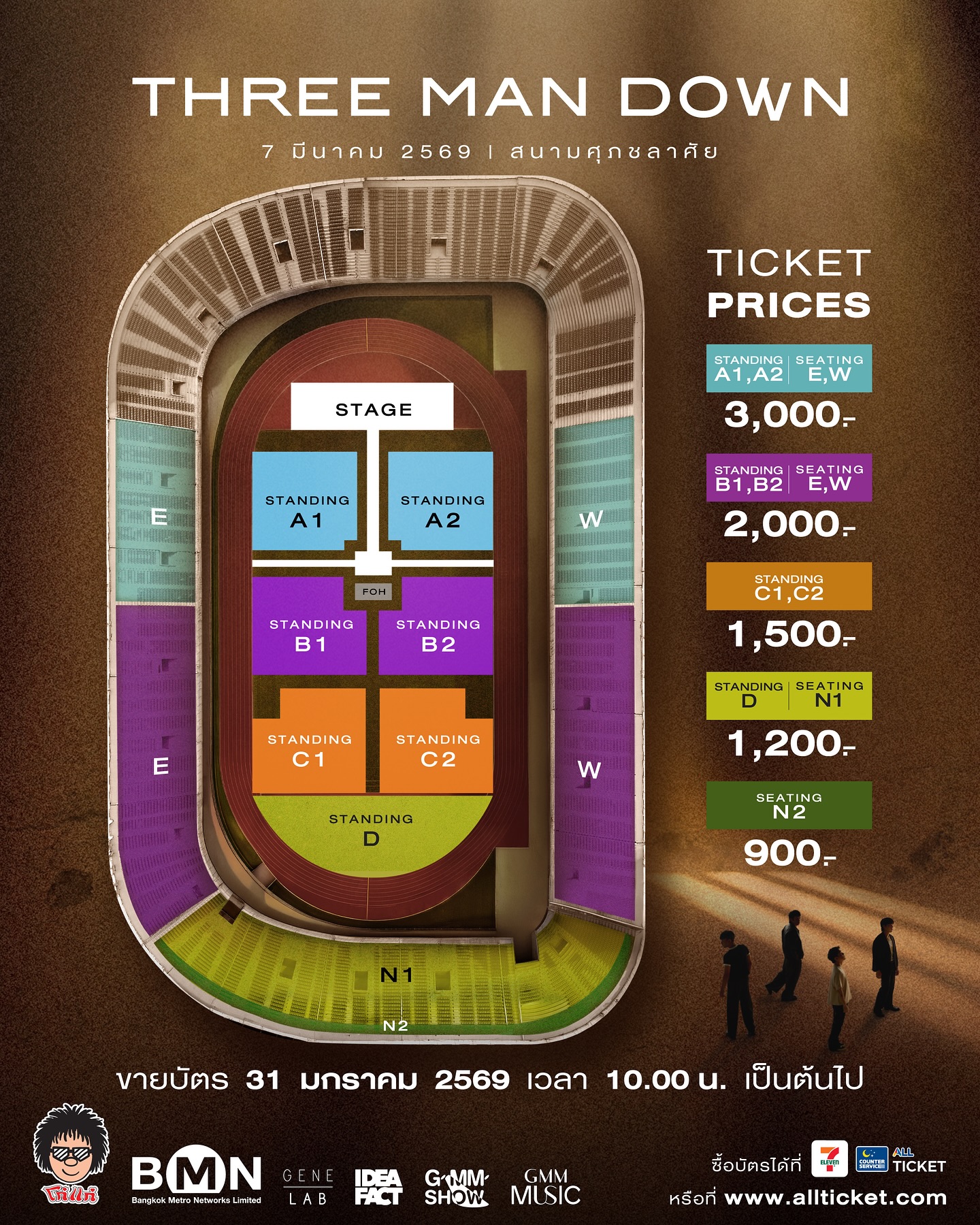 ถึงเวลาแล้วกับคอนเสิร์ต Three Man Down Live at สนามศุภชลาศัย วันที่ 7 มีนาคม 2569 เปิดจำหน่ายบัตรวันที่ 31 มกราคม 2569 เวลา 10.00 น. เป็นต้นไปที่ Counter Service All Ticket ในร้าน 7- Eleven หรือ www.allticket.com บัตรราคา 3,000 / 2,000 / 1,500 / 1,200 / 900 บาท สามารถติดตามรายละเอียดเพิ่มเติมได้ที่ รายละเอียดเพิ่มเติม facebook.com/threemandownofficial / instagram.com/threemandown / tiktok.com/@threemandownofficial / x.com/threemandown / facebook.com/genelabrecords / instagram.com/genelabrecords / tiktok.com/@genelabrecords / x.com/GeneLabRecords / facebook.com/gmmshow / instagram.com/gmmshow / tiktok.com/@gmmshow / x.com/GMMSHOW