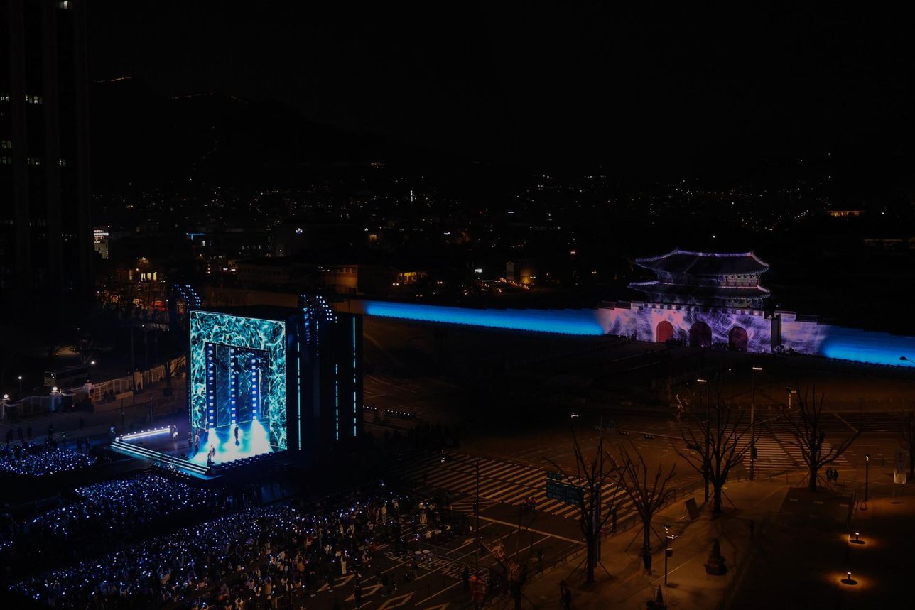 แม้ฉากเปิดจะทำออกมาได้ยิ่งใหญ่ด้วยมุมกล้องแพนจากประตูสู่ลานกว้าง แต่เมื่อเข้าสู่โชว์จริง เวที LED และกราฟิกกลับกลบความโดดเด่นของสถานที่ไปจนหมด ทำให้กวางฮวามุนแทบกลายเป็นเพียงฉากหลัง