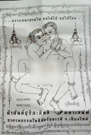 (16 มี.ค.) ผู้สื่อข่าวรายงานว่า พบภาพที่กล่าวกันว่าเป็น"ยันต์มหาเสน่ห์"ถูกส่งไปทั่วโลกอินเตอร์เน็ต เป็นภาพวาดลายไทยระหว่างชาย 2 คน ที่ลูบคลำอวัยวะเพศกันอย่างโจ่งครึ่ม มีข้อความด้านบนภาพว่า“ปรารถนาชายใด ขอให้ได้ ขอให้โดน” ขณะที่ด้านล่างของภาพระบุว่า"ผ้ายันต์ปุริสะสิทธิ มหาเสน่ห์ อาศรมธรรมโพธิสัตว์ สุขาวดี จ.เชียงใหม่"