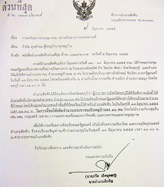 ว่อนเน็ต! เอกสารตราครุฑ"ด่วนที่สุด" อ้างผู้ว่าฯชลบุรี สั่ง อ.สัตหีบ เกณฑ์ชาวบ้าน 1 พันคน ต้อนรับยิ่งลักษณ์ ประชุมครม.สัญจร