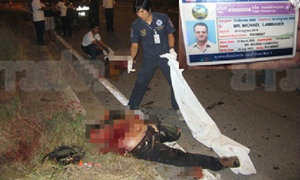 บริเวณฟุตปาธ ตรงเสาไฟฟ้าส่องสว่างริมทาง พบร่างชาวต่างชาติ ทราบชื่อคือ MR.MICHAEL LAMBAUER อายุ 39 ปี (ไม่ทราบสัญชาติ) ใส่เสื้อคอกลมสีดำ แขนสั้น มีเสื้อกั๊กสีดำสวมทับ นุ่งกางเกงยีนส์ขายาวสีดำ สวมรองเท้าหนัง อยู่ในสภาพศีรษะและตามร่างกายฉีกขาดจนแหลกเละ อวัยวะภายใน เช่นสำไส้ ตับ แตกกระจายเต็มพื้นถนน เป็นที่น่าหวาดกลัวต่อผู้ใช้ถนนผ่านไปมา