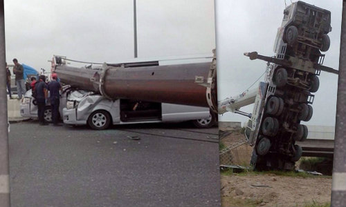 ระทึกขวัญ! รถเครนล้มทับรถตู้ 2 คัน ตาย 1 เจ็บระนาว