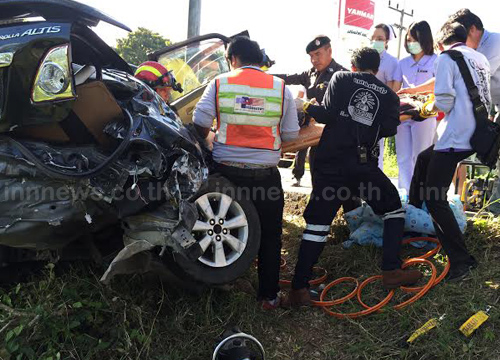 เชียงราย เก๋งเสียหลักชนต้นไม้เกาะกลางทาง เจ็บ 3 เจ้าหน้าที่งัดรถช่วย