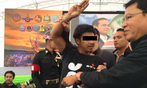 โดยเมื่อเวลา 09.50 น. เกิดเหตุกลุ่มชายใส่เสื้อดำ 5 คน เดินมาชู 3 นิ้วหน้าเวที ขณะนายกฯขึ้นเวทีมอบนโยบายให้กับเจ้าหน้าที่กรมป้องกันและบรรเทาสาธารณภัย ในกลุ่มจังหวัดภาคอีสาน บริเวณศาลากลาง จ.ขอนแก่น โดยอ้างว่าเป็นนักศึกษาคณะนิติศาสตร์ มหาวิทยาลัยขอนแก่น โดยเจ้าหน้าที่ได้พาตัวออกนอกสถานที่ทันที