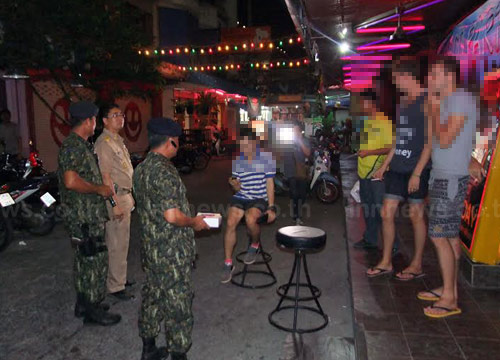 เมื่อช่วงดึกคืนที่ผ่านมา (14 มี.ค.) นายชาคร กัญจนวัตตะ นายอำเภอบางละมุง จ.ชลบุรี พร้อมด้วย ร.ท.วินัย ด้วงทอง รองหัวหน้าชุด ชป. มณฑลทหารบกที่ 14 ค่ายนวมินทราชินี จ.ชลบุรี สนธิกำลังฝ่ายปกครองและทหาร กว่า 50 นาย ปิดล้อมบาร์เกย์กว่า 20 ร้าน ตั้งอยู่ในซอยสุนีย์ พัทยาใต้ เพื่อตรวจสอบหาสารเสพติดพนักงานร้านทุกคน ทั้งนี้ ผลการปฏิบัติ พบว่ามีพนักงานร้านจำนวน 3 คน มีปัสสาวะเป็นสีม่วง จึงควบคุมตัวไปดำเนินคดีตามกฎหมาย