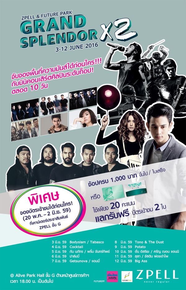 ศูนย์การค้าสเปลล์ และฟิวเจอร์พาร์ค ผนึกกำลังครั้งใหญ่ จัดงาน “Zpell & Future Park Grand Splendor X2” (สเปลล์ แอนด์ ฟิวเจอร์พาร์ค แกรนด์ สเปนเดอร์ ครอส ทู) ฉลองจัดหนักจัดเต็ม! ด้วยมินิคอนเสิร์ต สุดมันส์ จากศิลปินตัวท็อป อาทิ Bodyslam ,กัน นภัทร อินทร์ใจเอื้อ,ปาล์มมี่, Getsunova, Tono, POTATO, ฮั่น, ลุลา ,Big Ass ชมฟรี! ตลอด10 วัน ระหว่างวันที่ 3 -12 มิถุนายน 2559 ณ Alive Park Hall ศูนย์การค้าฟิวเจอร์พาร์ค พร้อมเสริมทัพ...ความสุขคูณสอง! เฉพาะวันศุกร์ เสาร์ อาทิตย์ ด้วยโชว์สุดเอ็กซ์คลูซีฟ จากเหล่าซุปตาร์แถวหน้าของเมืองไทย ประเดิมด้วย ปุ๊กลุ๊ก-ฝนทิพย์ วัชรตระกูล , ท็อป จรณ โสรัตน์,เจนี่ เทียนโพธิ์สุวรรณ เป็นต้น ณ สปอร์ตไลท์ ชั้น จี ศูนย์การค้า สเปลล์ แอทฟิวเจอร์พาร์ค