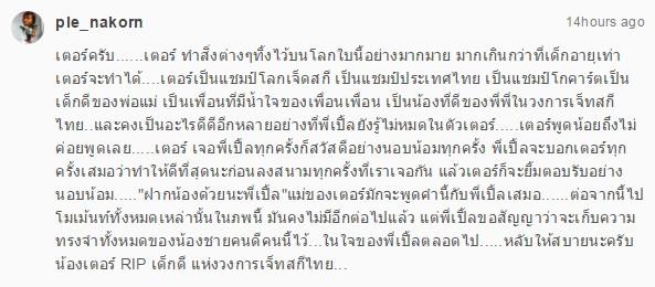 น้องคอปเตอร์ แชมป์โลกเจ็ทสกี วัย 14 ปี ถูกเจ็ทสกีชนดับน้องคอปเตอร์ วัย 14 ปี นักกีฬาเจ็ทสกีทีมเยาวชนเจ้าของแชมป์โลก 2015 พลัดตกน้ำขณะซ้อม ถูกเจ็ทสกีชนดับ