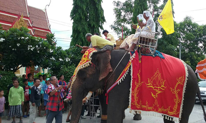 ชาวบ้านฮือฮา ขบวนขี่ช้างแห่นาค โปรยทานด้วยทองคำ